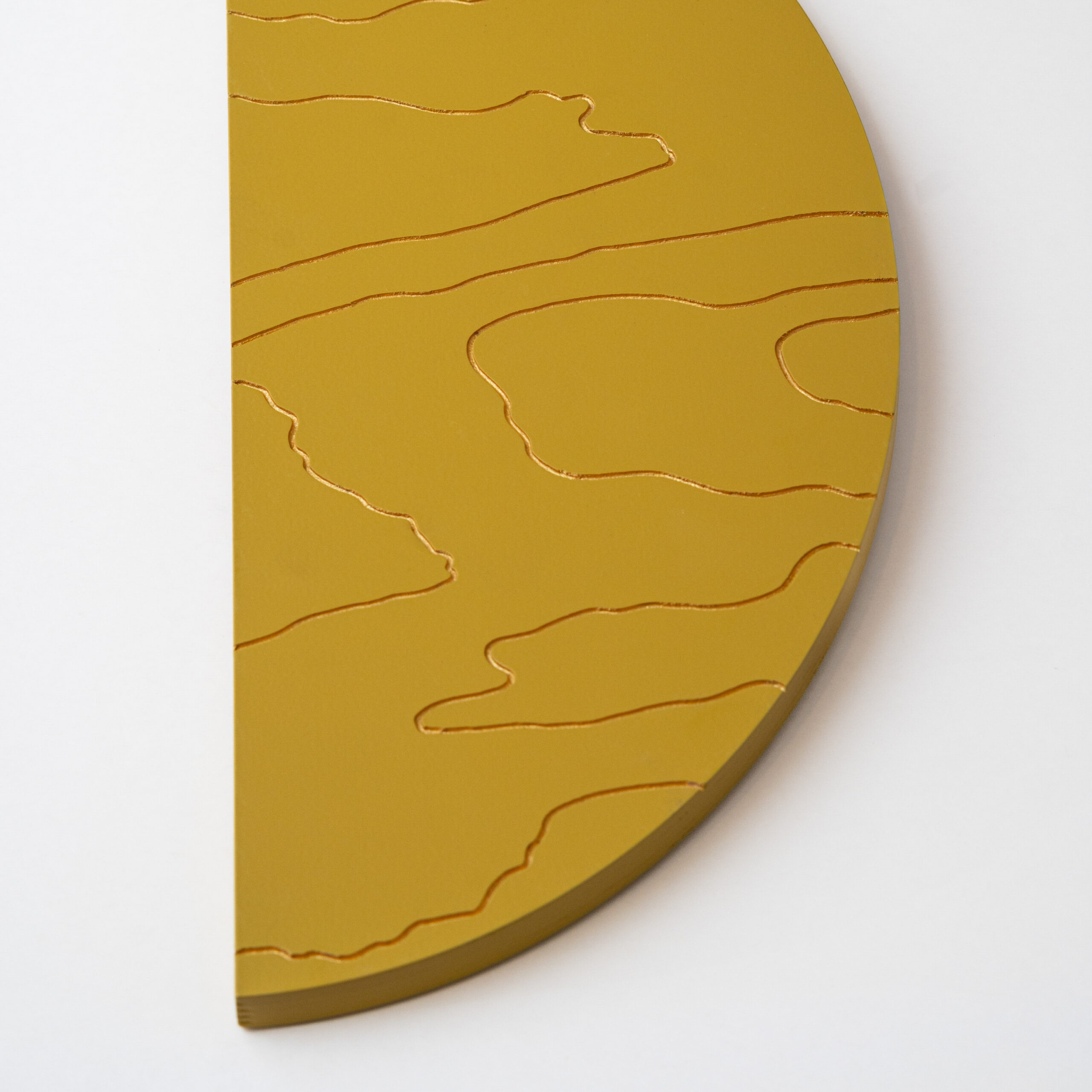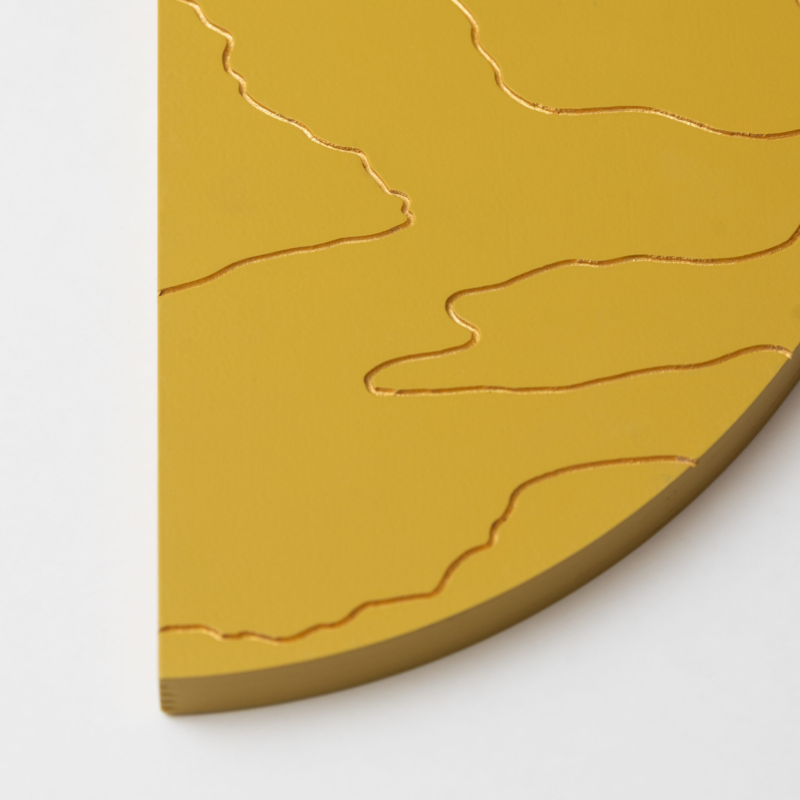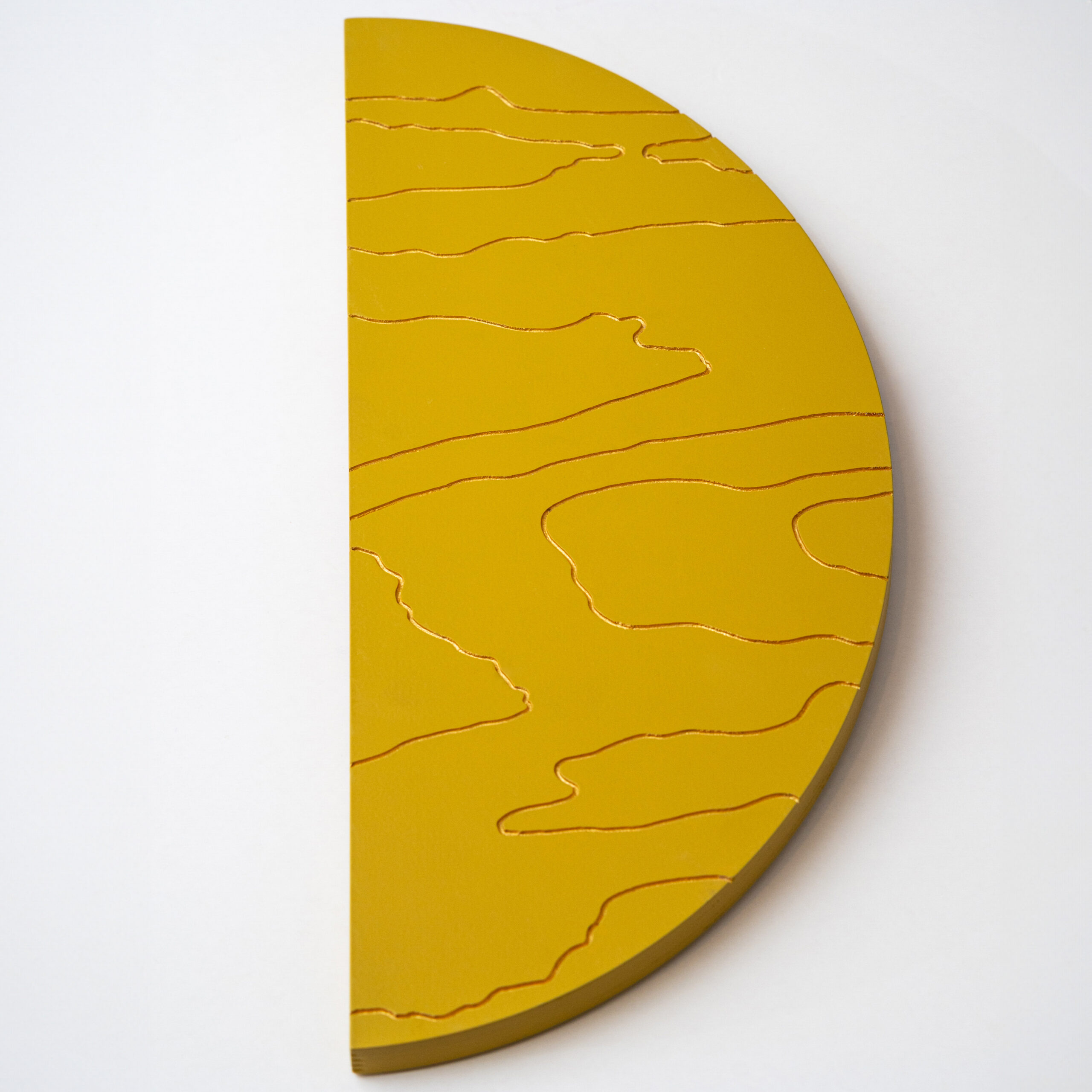 Mahe sinepikollane teos, mida läbib justkui kuldne valgus. Särav meeldetuletus rõõmust ja alati olemasolevast sisemisest valgusest. Kuldsed jooned voogavad üle puidu nagu valguse jõgi, ning just nagu jõed süvendavad maad, on need jooned graveeritud vineeri sisse. Las selle särav ilu meenutab piiritut rõõmu, mis elab Sinu sees ja ümber.