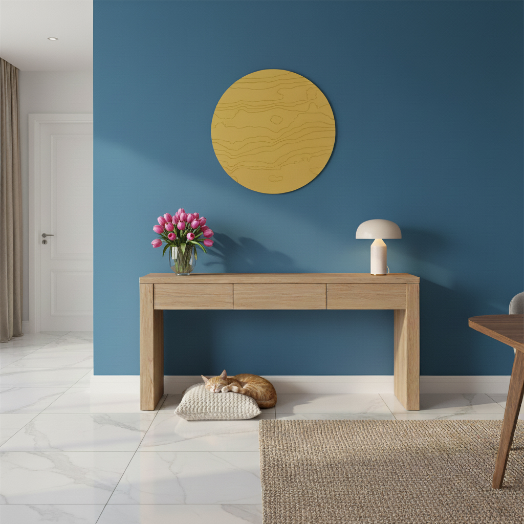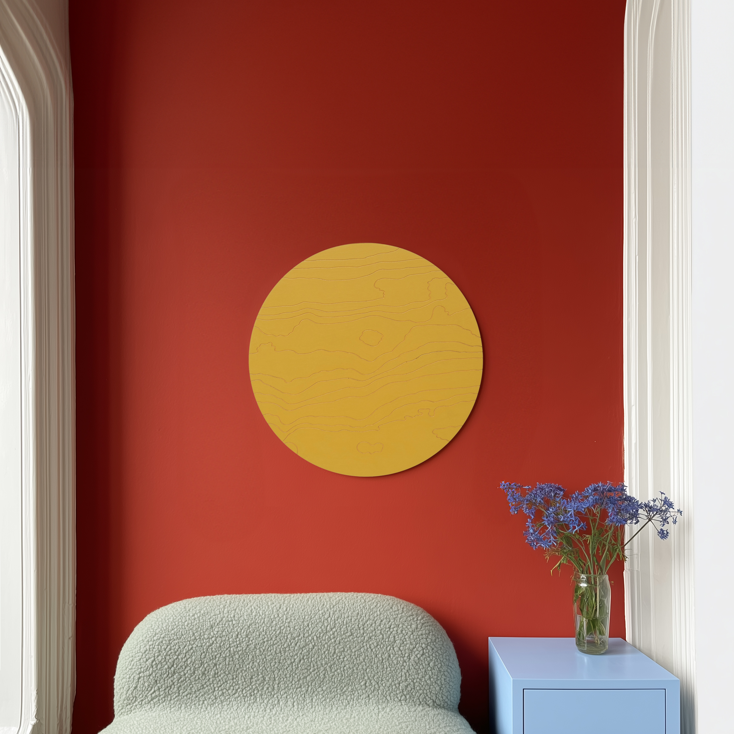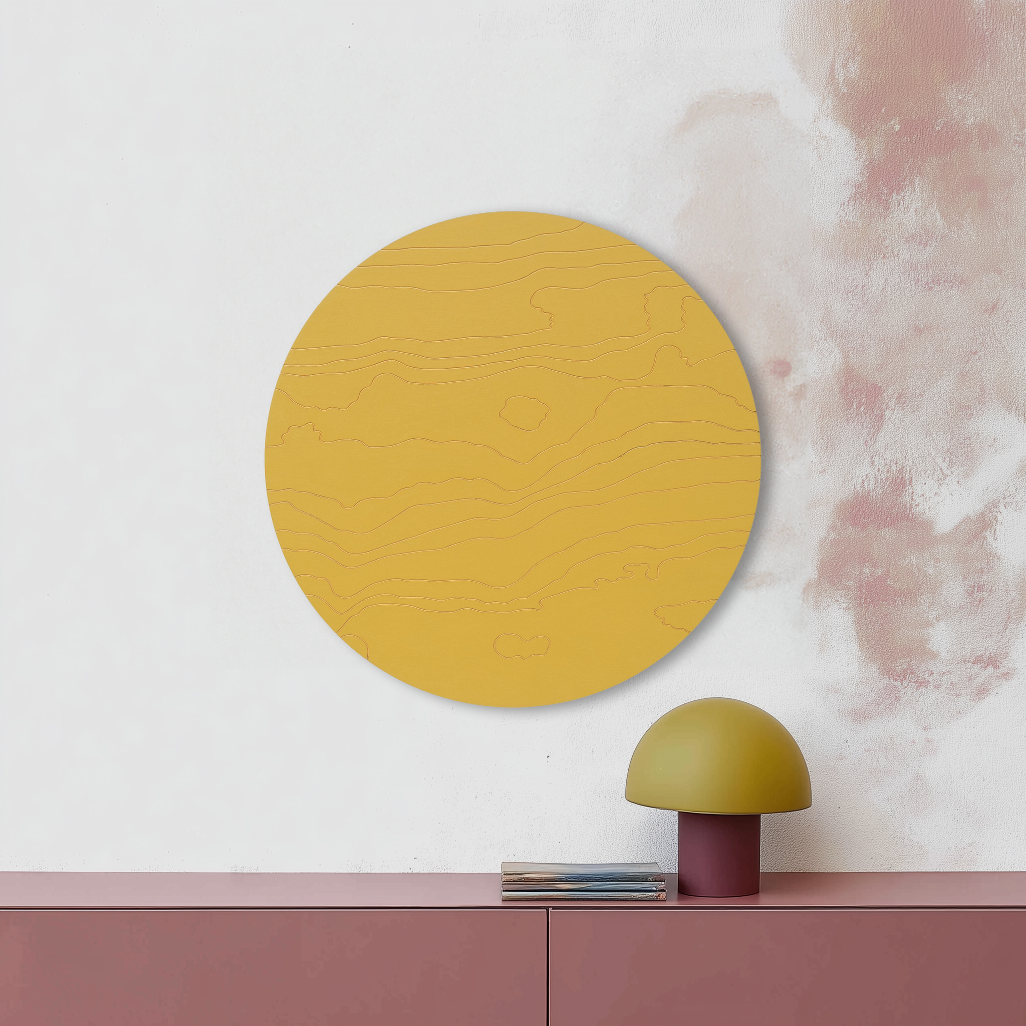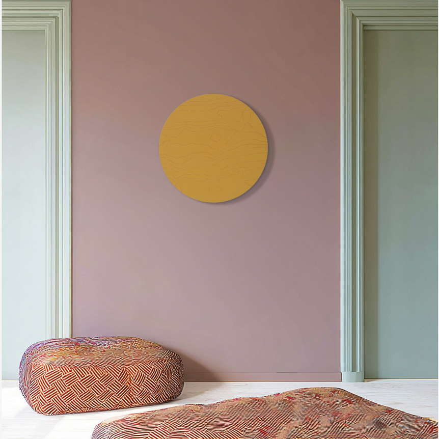 Mahe sinepikollane teos, mida läbib juskui kuldne valgus. Särav meeldetuletus rõõmust ja alati olemasolevast sisemisest valgusest. Kuldsed jooned voogavad üle puidu nagu valguse jõgi, ning just nagu jõed süvendavad maad, on need jooned graveeritud vineeri sisse. Las selle särav ilu meenutab piiritut rõõmu, mis elab Sinu sees ja ümber.